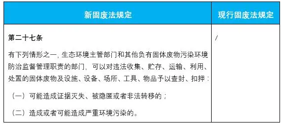 4.明確了對違法收集、貯存、運輸、利用、處置的固體廢物及設(shè)施、設(shè)備、場所、工具、物品予以查封、扣押的規(guī)定